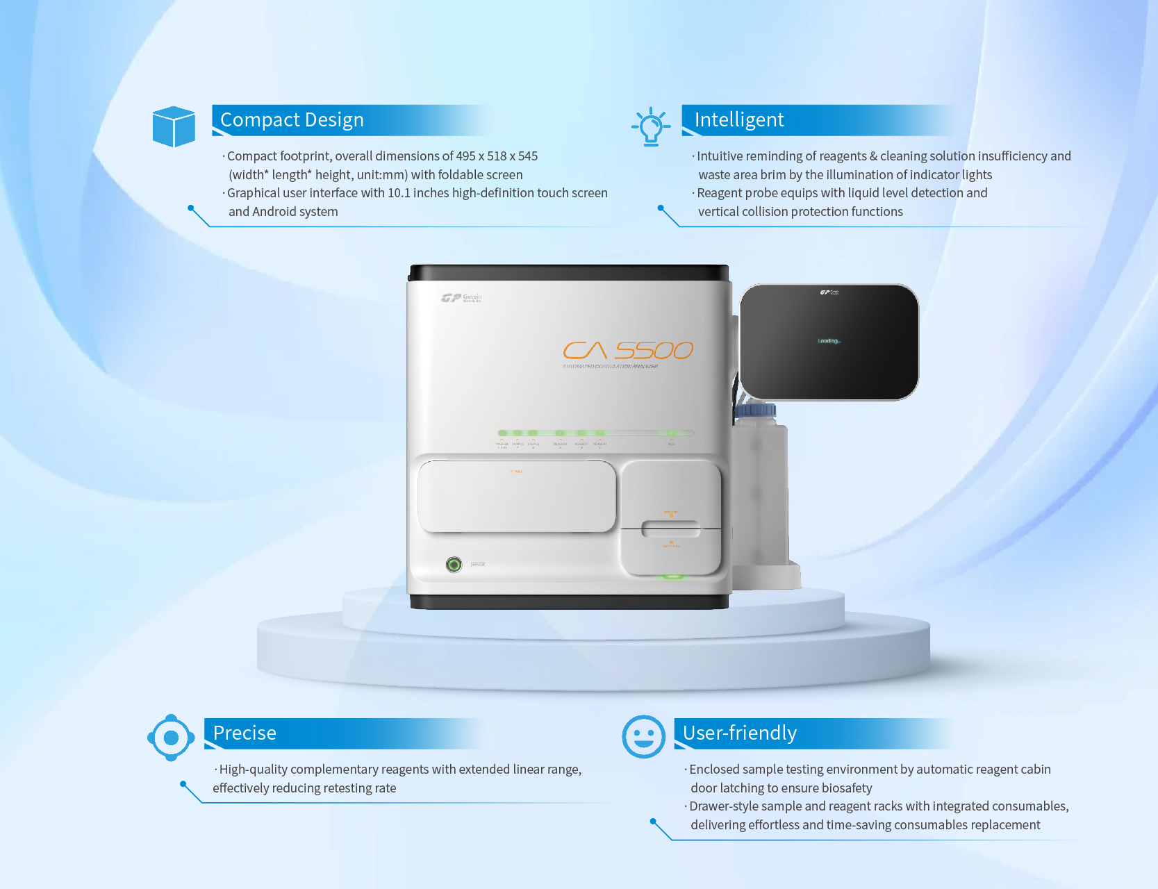 CA-5500 — это компактное и надежное решение для лабораторий и больниц, нуждающихся в анализе гемостаза. Этот интегрированный анализатор использует метод детектирования в проходящем свете для анализа сгустков, а также хромогенные и иммунотурбидиметрические методы для специализированных исследований. Сочетание высококачественных результатов и высокой производительности делает его превосходным выбором для широкого спектра применений.